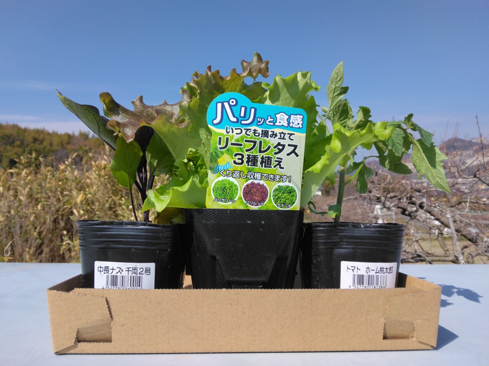その情報を信じてダイキに行くと、ピーマンの姿はどこにもなくて、目に留まったのはナスの苗。大玉トマトのホーム太郎と仲良く棚に並んでいた。買うか買わぬか……まだ寒い。少し悩んで、1本ずつだけ買おうと決めた。キャベツのコンパニオンプランツとして、レタスも購入。