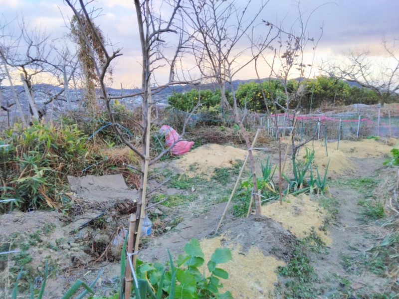 まずは、ジャガイモの畝つくり。土を耕して元肥と米ぬかを入れ、もみ殻マルチを施して準備終了。今年は、土の状態がよさそうだ。2月になったら種芋を植えよう。